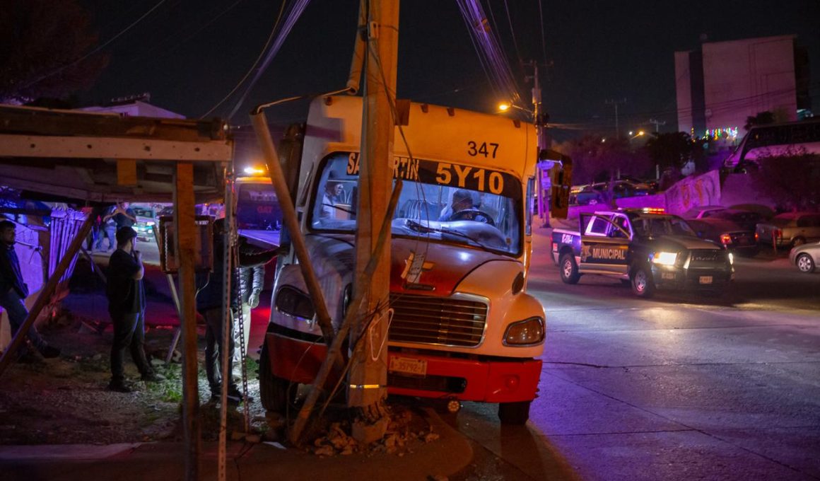 TIJUANA.– Momentos de pánico vivieron más de 20 pasajeros la noche del jueves en el fraccionamiento Lomas de San Martín, luego de que un camión de transporte público presuntamente se quedara sin frenos y terminara chocando contra un poste de concreto.