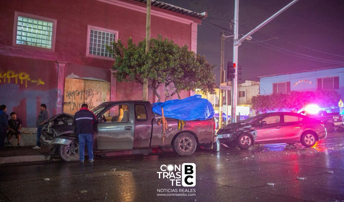 El accidente involucró a un Honda Civic con placas nacionales y una camioneta Ford F-150 con placas de California, los cuales colisionaron de manera frontal, provocando afectaciones visibles en la carrocería de ambas unidades.