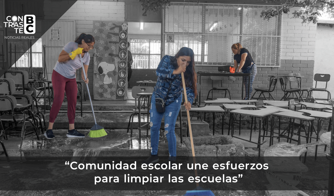 Armados con escobas, cubetas, cloro y jabón, los integrantes de la comunidad educativa realizaron una sanitización completa de aulas, patios y áreas comunes, como parte de las medidas preventivas impulsadas por el Gobierno del Estado y la Secretaría de Educación de Baja California tras la suspensión temporal de clases en varios municipios.