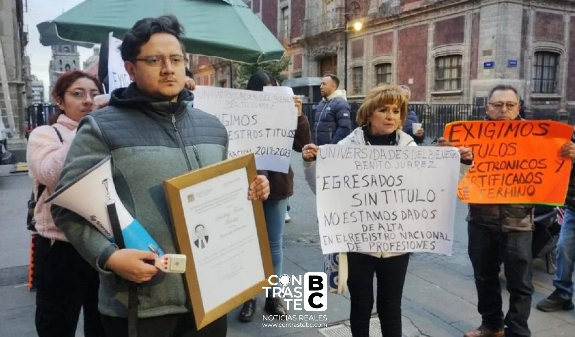 CIUDAD DE MÉXICO.— Egresados de las Universidades para el Bienestar Benito Juárez García (UBBJ) se manifestaron este lunes frente a Palacio Nacional para exigir lo que consideran un derecho básico: recibir su título profesional y cédula que acredite sus estudios. A pesar de haber concluido sus carreras desde hace más de un año, cientos de jóvenes siguen sin poder ejercer, ni acceder a plazas laborales o continuar estudios de posgrado.