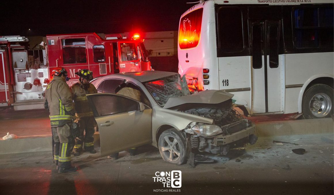 Tijuana B.C..- Un aparatoso accidente se registró la noche del lunes 24 de noviembre en el Corredor 2000, a la altura de Valle Bonito, donde un automóvil Chevrolet Malibú color café terminó incrustado en la parte trasera de un camión de transporte de personal de la empresa TEBSA, identificado con el número económico 118. El choque por alcance dejó daños considerables y una persona lesionada.