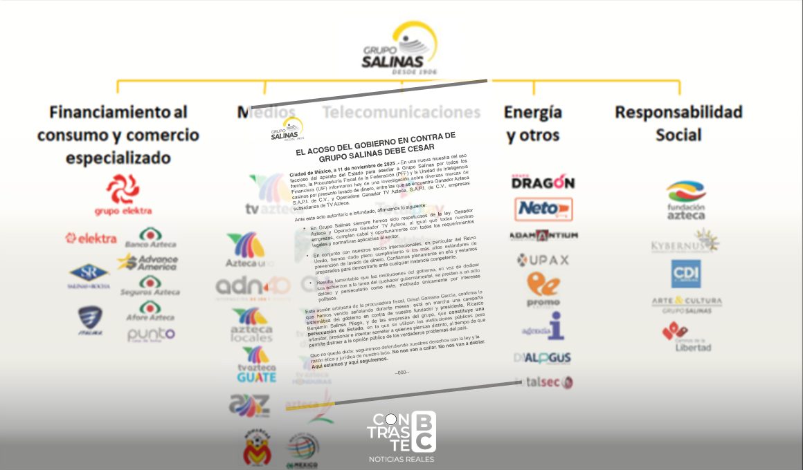 Ciudad de México. – Grupo Salinas emitió un comunicado en el que denunció una nueva acción de lo que considera un uso faccioso del poder público por parte del gobierno federal, tras el anuncio de una investigación de la Procuraduría Fiscal de la Federación (PFF) y la Unidad de Inteligencia Financiera (UIF) sobre presunto lavado de dinero relacionado con algunas de sus empresas, entre ellas Ganador Azteca y Operadora Ganador TV Azteca.