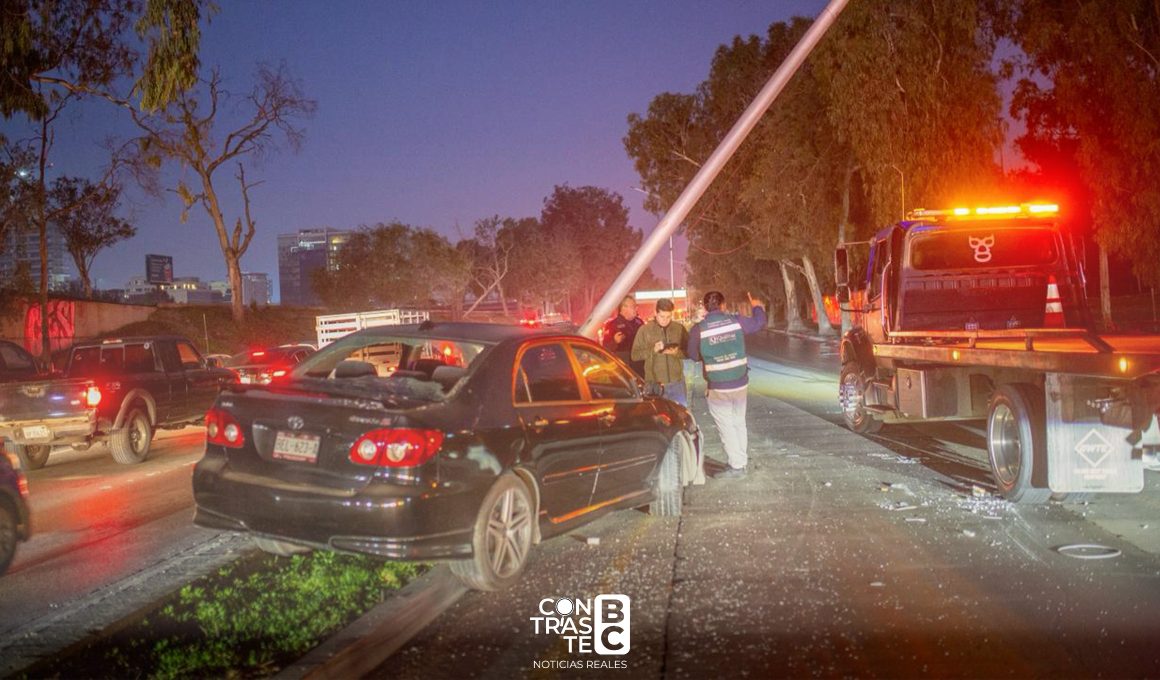 Tijuana, B.C..- Un aparatoso accidente registrado durante la madrugada de este martes 2 de diciembre dejó como saldo daños materiales significativos y un fuerte congestionamiento vehicular en la Vía Rápida Oriente, a la altura del parque de Las Quinceañeras, en Tijuana. Un joven conductor perdió el control de su automóvil y terminó derribando un poste de alumbrado público, situación que movilizó a personal de emergencia y peritos municipales.