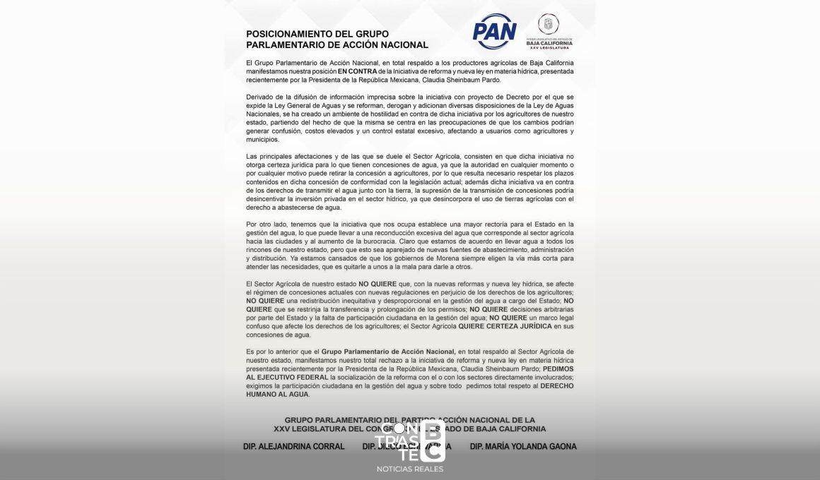 Baja California.- El Grupo Parlamentario del Partido Acción Nacional (PAN) en Baja California fijó su postura en contra de la iniciativa de reforma y la nueva ley en materia hídrica presentada por la presidenta de México, Claudia Sheinbaum Pardo, al considerar que dicha propuesta afectará directamente a productores agrícolas y usuarios del agua en la entidad.