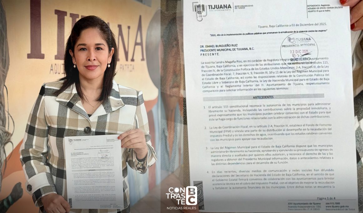Tijuana, B.C..- La regidora Sandra Magaña presentó un oficio dirigido al alcalde de Tijuana para exigir claridad sobre el convenio de colaboración con el Gobierno del Estado relacionado con el cobro de cuentas del impuesto predial. La edil señaló que la ciudadanía merece total transparencia respecto a cualquier acuerdo que involucre recursos municipales.