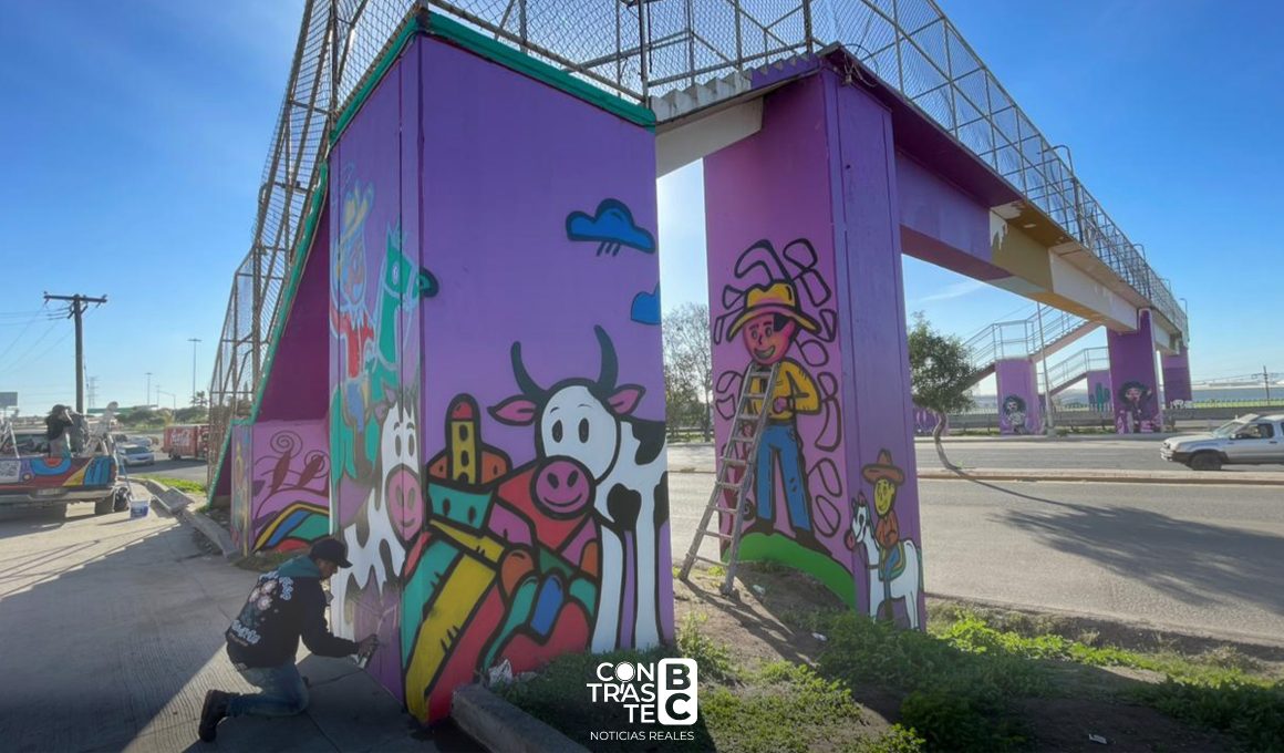 El primer mural rinde homenaje a la memoria agrícola de la zona conocida como la Tomatera, un territorio que durante décadas fue fundamental para la economía local gracias al cultivo de tomate y la crianza de animales. La obra destaca la presencia de vacas y elementos rurales que evocan la vida campestre, recordando a quienes formaron parte de esa etapa en la evolución de Rosarito. Este puente, que nunca había recibido una intervención artística, se convierte ahora en un símbolo visual de arraigo y transformación.