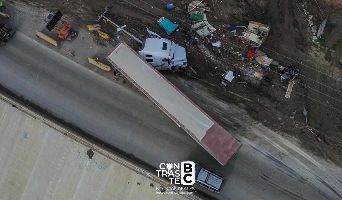 La mañana de este martes 6 de enero, un tráiler protagonizó un aparatoso accidente al salirse del camino sobre la Vía Rápida Alamar, a la altura del Ejido Chilpancingo, en Tijuana, dejando a su paso infraestructura urbana severamente dañada.